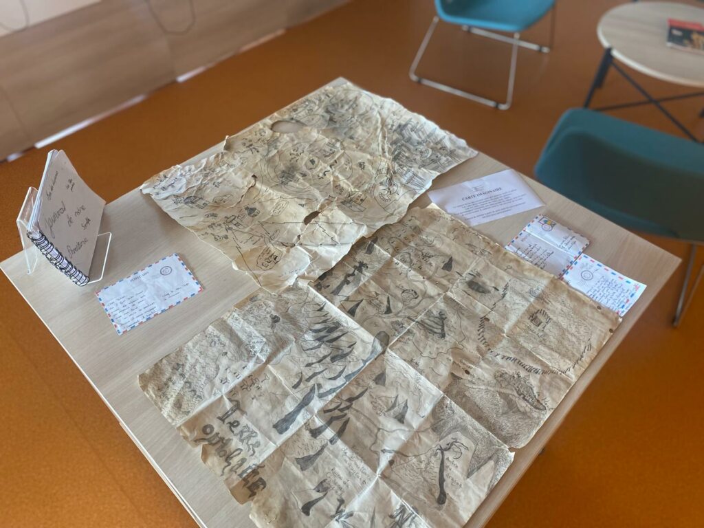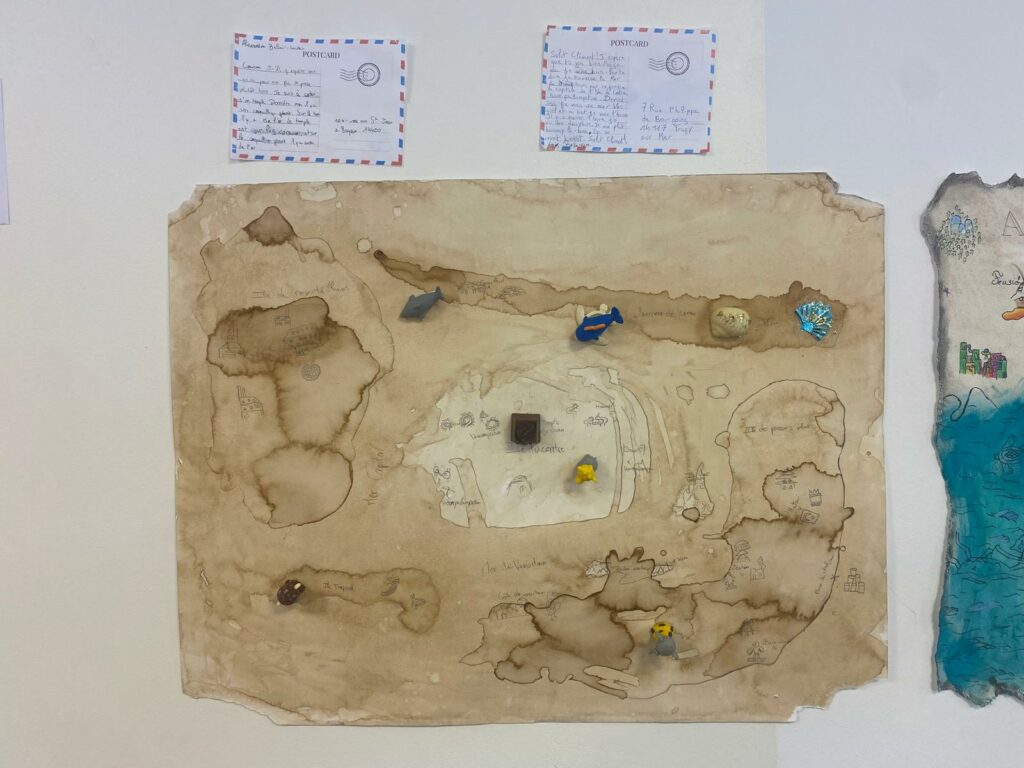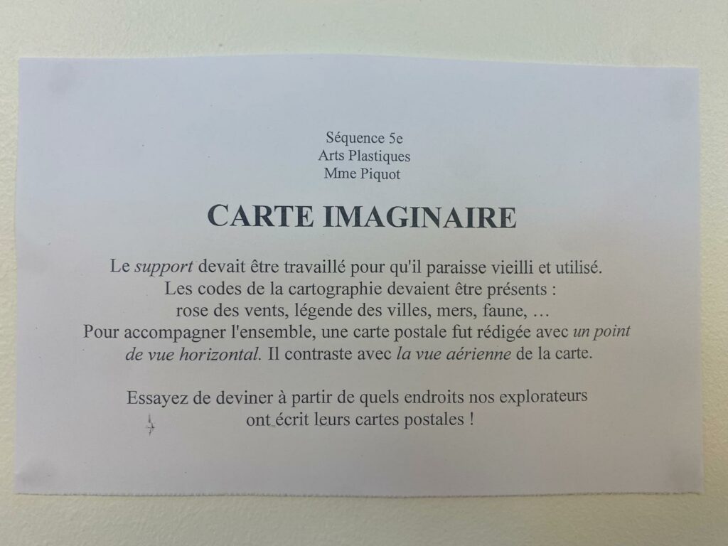 Les élèves de cinquième de Mme Piquot, professeure d‘arts plastiques, devaient réaliser la carte d’un pays imaginaire, un pays rêvé, fantastique et merveilleux. Le support devait être travaillé pour qu’il paraisse vieilli, et contenir les codes de la cartographie : rose des vents, légende des villes, mers, faune… Elle devait être accompagnée d’une carte postale indiquant le lieu d’où elle a été écrite. Venez découvrir les œuvres des élèves au CDI et tentez de deviner à partir de quels endroits nos explorateurs ont écrit leurs cartes postales !